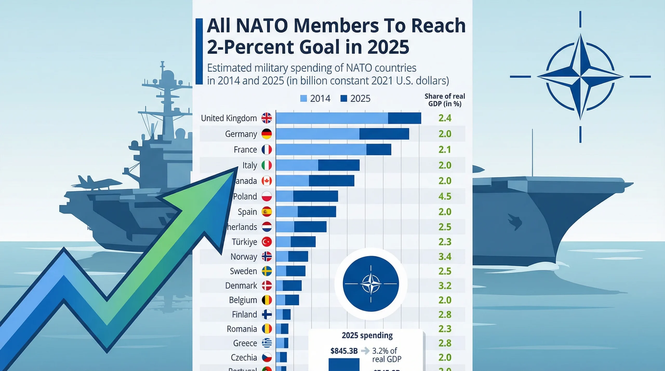 Změny jsou patrné i v rámci NATO. Zatímco v roce 2014 plnilo závazek 2 % HDP na obranu jen několik členů, nyní se k tomuto cíli hlásí všichni. To přineslo stabilní příliv zakázek v celém obranném řetězci, od výrobců munice po firmy vyvíjející pokročilé radarové systémy.